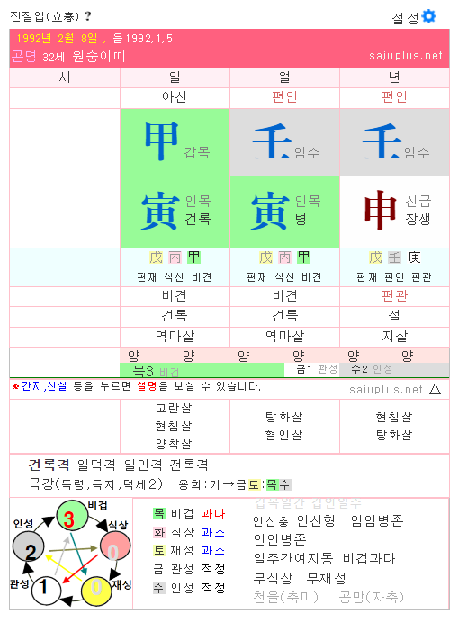 월지 인목으로 비견으로 비견격이다. 게다가 갑인 일주로 간여지동 사주에 해당하고